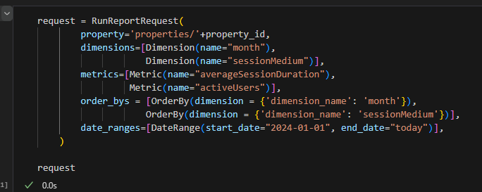 - 요청 준비: request 객체에는 보고서에 포함할 날짜 범위, 차원, 메트릭 등의 정보가 설정되어 있습니다.