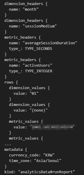 - API 호출: client.run_report(request)를 호출하여 Google Analytics Data API에 request에 정의된 조건에 맞는 보고서를 요청합니다.