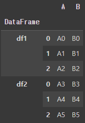 keys=['df1', 'df2']는 각 데이터프레임을 구분하는 상위 인덱스를 추가하는 역할을 합니다.