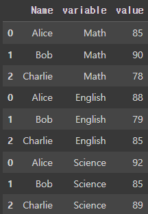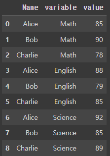 melted_df = pd.melt(df, id_vars='Name', value_vars=['Math', 'English', 'Science'], var_name='Subject', value_name='Score')