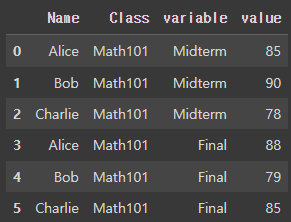 - id_vars=['Name', 'Class']: Name과 Class 열이 그대로 유지되며, Midterm과 Final 열이 긴 형식으로 변환됩니다.