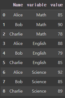 melted_df = pd.melt(df, id_vars='Name', value_vars=['Math', 'English', 'Science'], var_name='Subject', value_name='Score')