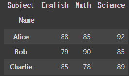 melted_df.pivot(index='Name', columns='Subject', values='Score')