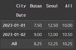 위의 결과는 pivot()과 비슷하지만, 중복된 데이터를 처리할 수 있다는 점에서 pivot_table()이 더 유연합니다. 위 예시처럼 같은 Date와 City에 대해 여러 값이 있다면 aggfunc='mean'을 통해 평균값이 계산됩니다.
