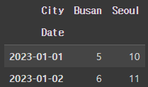 위의 결과는 pivot()과 비슷하지만, 중복된 데이터를 처리할 수 있다는 점에서 pivot_table()이 더 유연합니다. 위 예시처럼 같은 Date와 City에 대해 여러 값이 있다면 aggfunc='mean'을 통해 평균값이 계산됩니다.